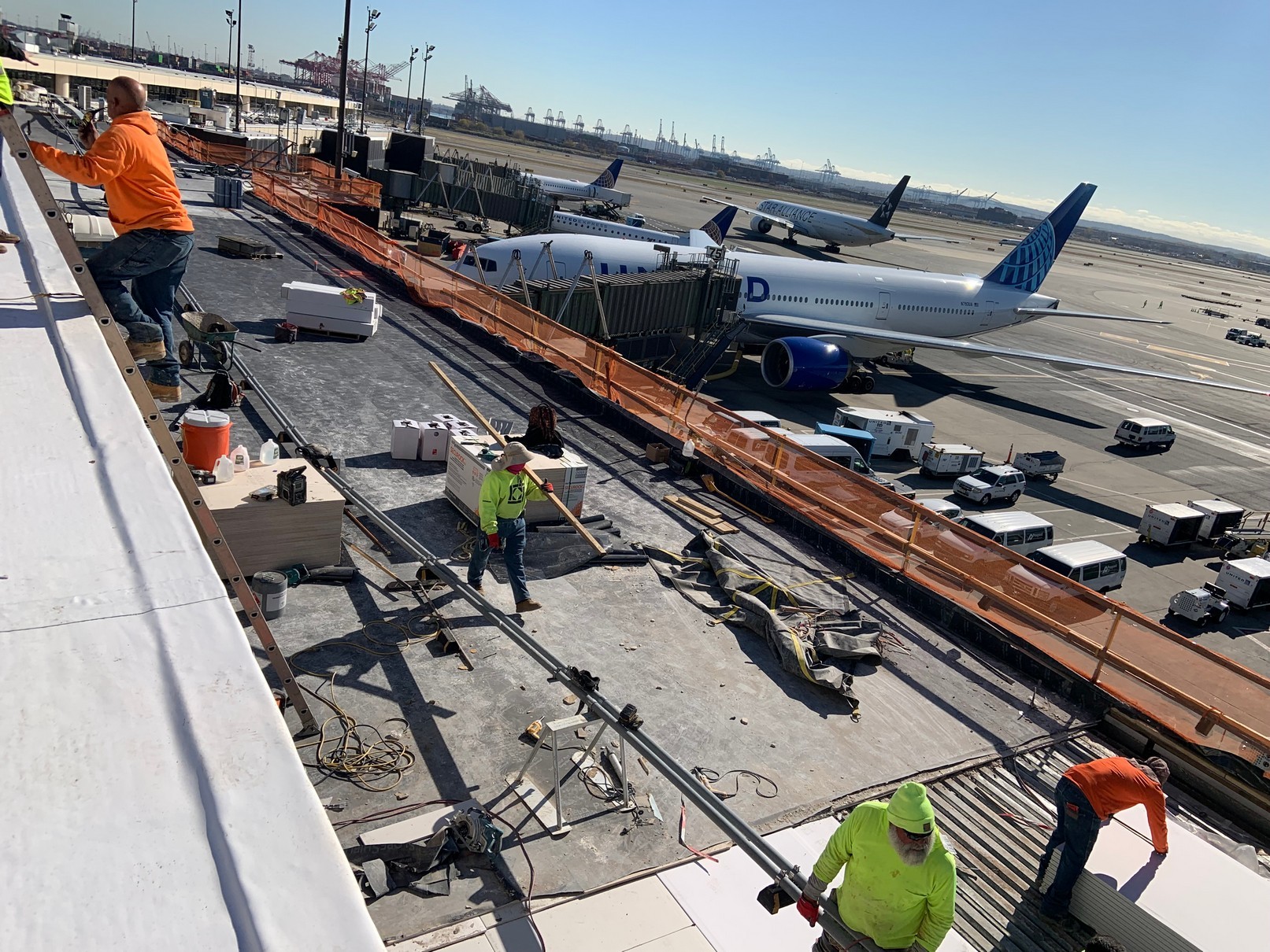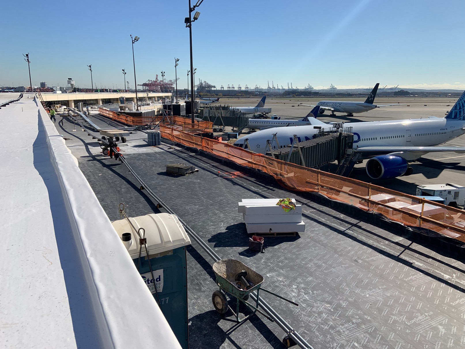 Over 375,000 sq.ft. of SlopeShield Plus Self-Adhered was installed on a low slope roof over a combination of new and existing gypsum recovery board at the Newark Liberty International Airport, Terminal C Roof Replacement project.