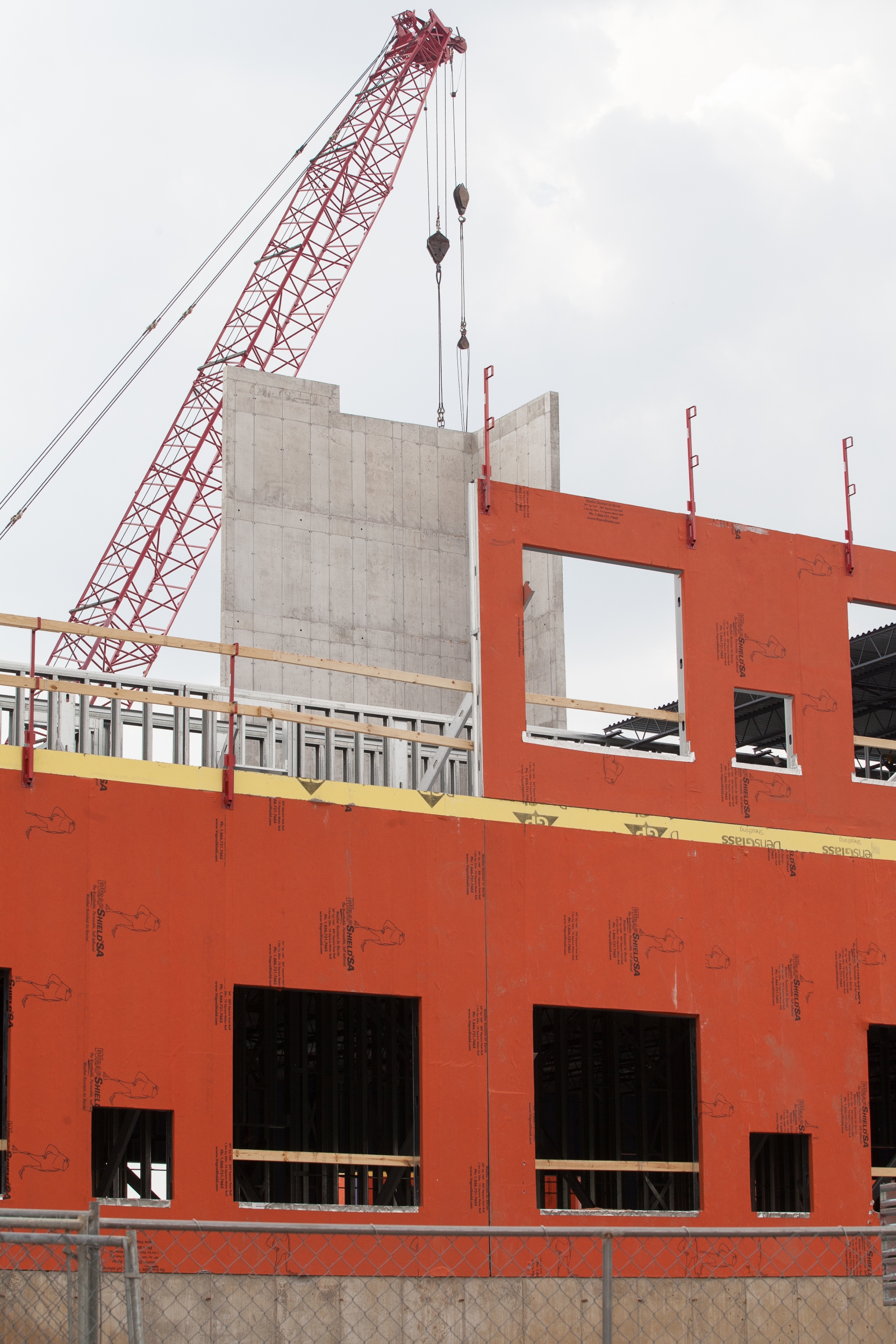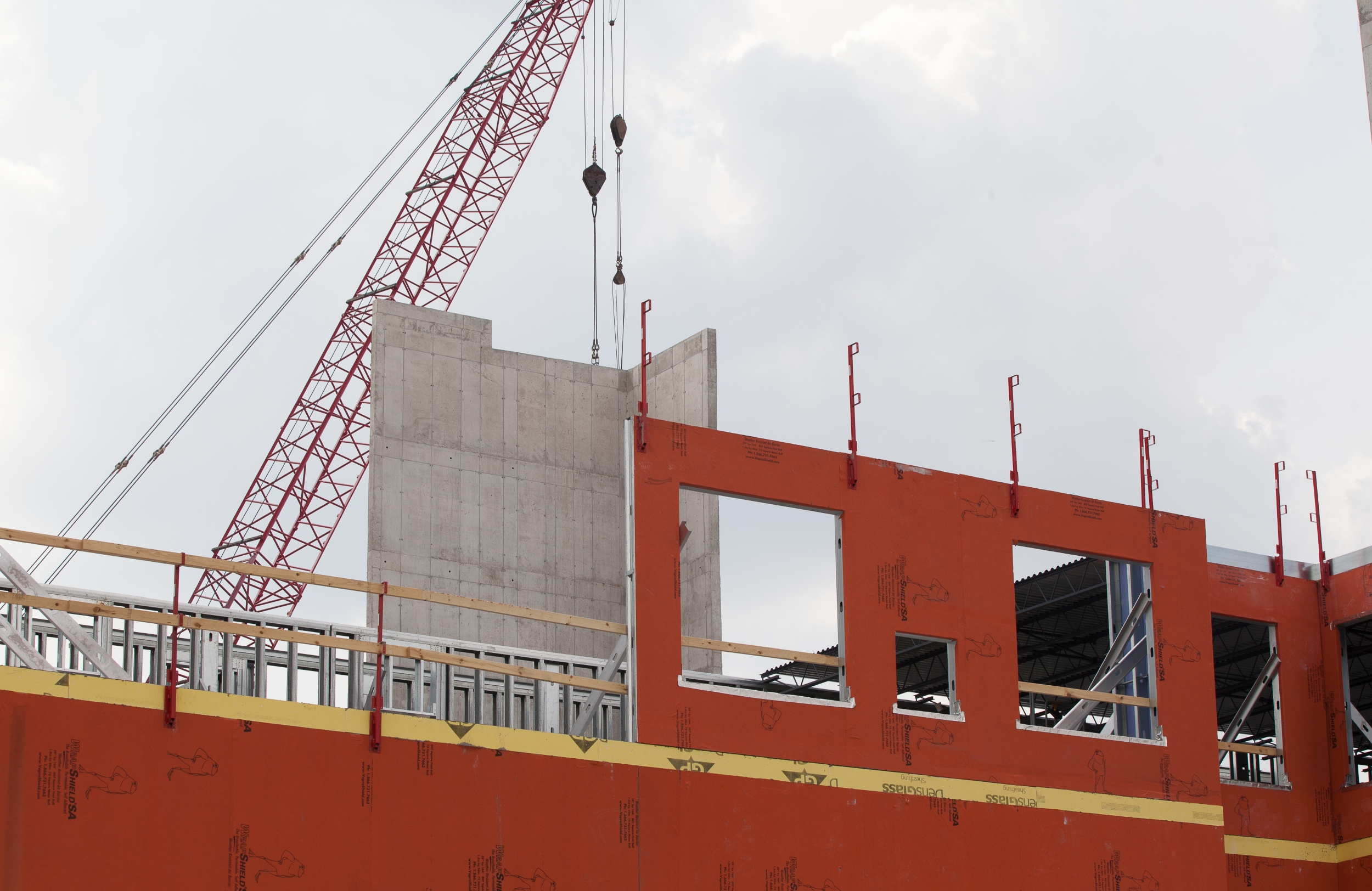 Approximately 270,000 sq.ft. of WrapShield SA Self Adhered Water Resistive Vapor Permeable Air Barrier Sheet Membrane is being installed on the new 9-story $90M Skyvue apartment building in Lansing. The panelized construction began at RGC in North Carolina where the panels were fabricated and WrapShield SA Self Adhered was applied directly to the sheathing, then Vapro-SS Flashing was added around the rough openings. The panels were then shipped to Lansing, Michigan where they are being erected on the Skyvue project.