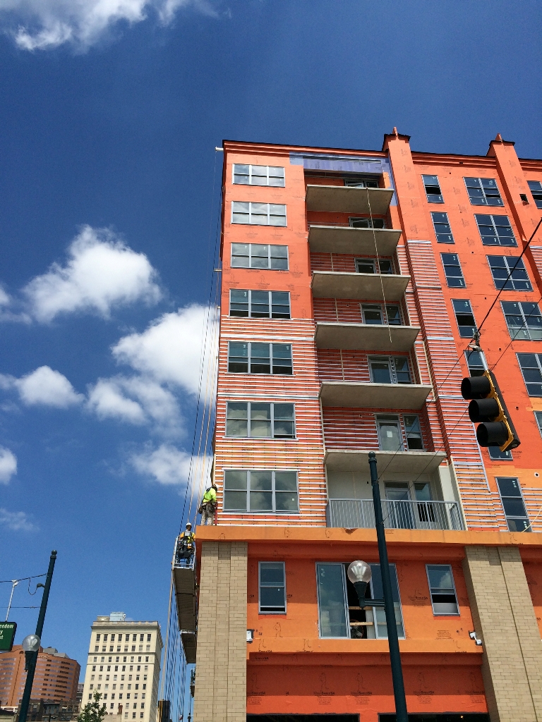 The Radius at the Banks project in Cincinnati switched to WrapShield SA Self-Adhered Water Resistive Vapor Permeable Air Barrier Membrane, citing the product’s versatility and ability to be installed in temperatures that were too cold for the originally specified fluid-applied barrier. The Radius at the Banks contractor noted WrapShield SA Self-Adhered worked in conjunction with the construction schedule because the product does not require special installation equipment, offered labor savings and there was no overspray in the windy, high-rise downtown conditions (because the product is self-adhered).